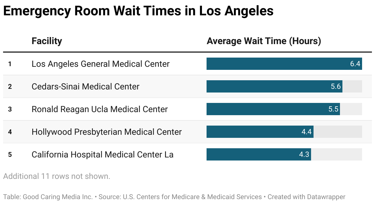 - California Hospital Medical Center Los Angeles, with an average wait time of 4.3 hours, ranks fifth for the longest ER wait time in Los Angeles